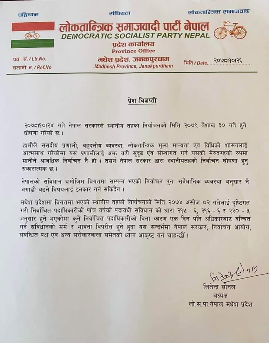 लोसपाका मधेश प्रदेशका अध्यक्ष जितेन्द्र सोनलले बुधबार एक विज्ञप्ति जारी गर्दै २०७९ असोजमा स्थानीय निर्वाचन गर्न माग गरेका हुन् । उनले सरकारले स्थानीय निर्वाचनको घोषणा गर्नु सकारात्मक रहेको तर बैशाख ३० मा चुनाव भए २ असोज २०७४ मा निर्वाचित भएका मधेश प्रदेशका जनप्रतिनिधिको अधिकार कुण्ठित हुने बताएका छन् ।