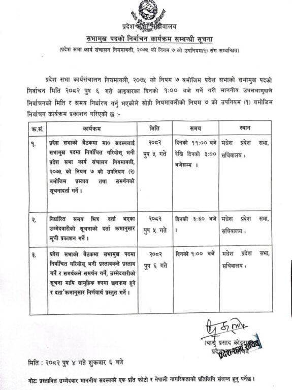 त्यसका लागि शनिबार बिहान ११ बजेदेखि दिउँसो ३ बजेसम्म प्रदेश सभा सचिवालयमा उम्मेदवारी दर्ता गर्ने कार्यक्रम छ । दर्ता भएका उम्मेदवारहरूको नामावली शनिबार दिउँसो साढे ३ बजे प्रकाशित गरिनेछ।