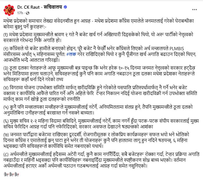 कांग्रेसको नेतृत्वमा रहेको अर्थ मन्त्रालयले मंसिर महिनासम्म पीएलएमबीआईएस लक गरेर राखेको र यसबारे मुख्यमन्त्री सतिशकुमार सिंहले अर्थमन्त्री सुनिलकुमार यादवलाई सोध्दा कुनै सुनुवाइ नभएको आरोप लगाएको छ । प्रमुख सचिव दुई–दुई महिना बिदा बसिदिने, मुख्यमन्त्रीलाई नटेर्ने तथा संघीय सरकारलाई प्रमुख सचिव फेर्न पटक–पटक आग्रह गर्दा कुनै सुनुवाइ नगरेको आरोप जनमतले लगाएको छ । बजेटमा राखेको दूरदर्शी, रोजगारमुलक तथा लोकप्रिय कार्यक्रम सफल भए भोलिका दिनमा आफूहरुलाई राजनीतिक घाटा हुने भन्दै कांग्रेस र एमाले विभिन्न षड्यन्त्र गरेर रोक्ने काम गरेको पनि जनमत पार्टी शुक्रवार आठ बुँदे धारणा सार्वजनिक गदै भनेको छ ।