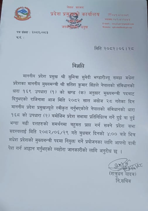 प्रदेश प्रमुख सुमित्रा सुवेदी भण्डारीले संविधानको धारा १६८ को उपधारा (२) बमोजिम बहुमतको आधारमा नयाँ मुख्यमन्त्री नियुक्त गर्नका लागि दलहरूलाई बुधबार अपराह्न ४ बजेसम्म दाबी पेश गर्न आह्वान गरेकी हुन् ।