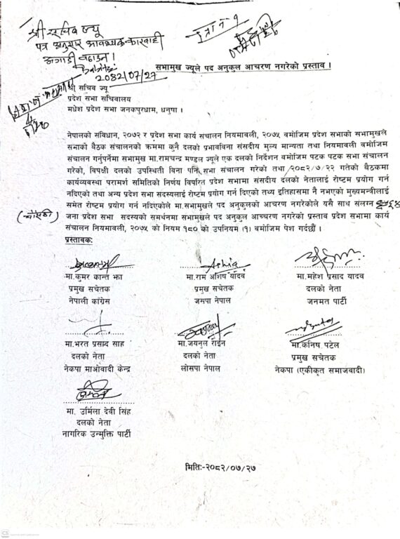 सभामुख मण्डलले पदीय मर्यादा विपरीत काम गरेको भन्दै ७ दलका ६४ जना सांसदले मधेश प्रदेश सभामा महाभियोग दर्ता गराएका छन् ।