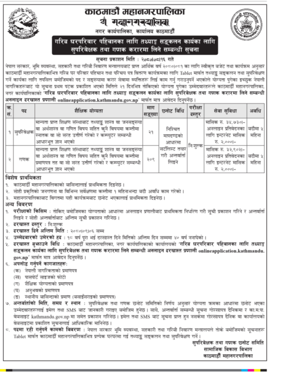 काठमाण्डु- काठमाण्डु महानगरपालिकाले करारमा २३० जना सुपरिवेक्षक तथा गणक माग गरेको छ । गरिब घरपरिवार पहिचानका लागि तथ्यांक संकलन गर्न सुपरिवेक्षक तथा गणक माग गरिएको महानगरले जनाएको छ ।