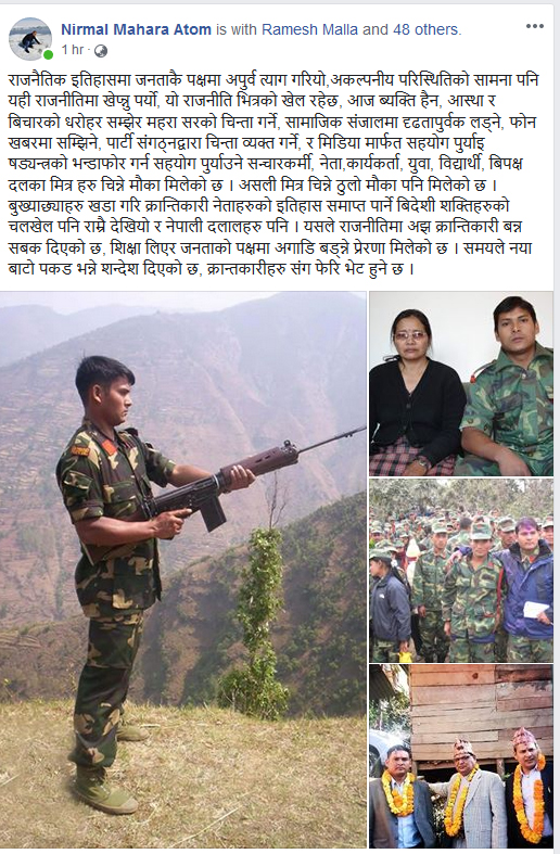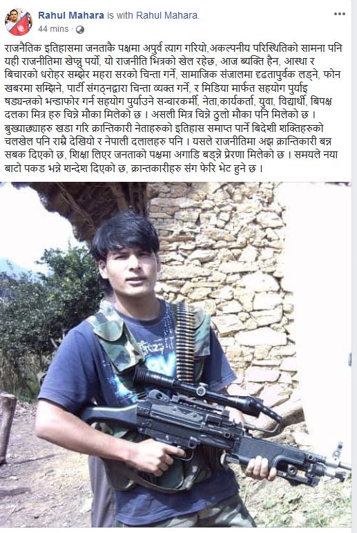 काठमाडौं – यौन दूव्र्यवहारको आरोप लागेर सभामुखबाट राजीनामा दिएका कृष्ण बहादुर महराका छोराहरुले क्रान्तिकारी नेताहरुको इतिहास समाप्त पार्न विदेशी शक्तिहरु लागे संकेत गरेका छन् । महराका छोराहरु निर्मल महरा ‘एटम’ र राहुल महराले सामाजिक संजाल फेसबुकमा बन्दुक समाएको फोटो राख्दै समयले नयां बाटो पकड्ने र क्रान्तिकारीहरुसंग फेरि भेट हुने उल्लेख गरेका छन् । एटम र राहुल दुवै नेकपाका राजनीतिमा सक्रिय छन् ।