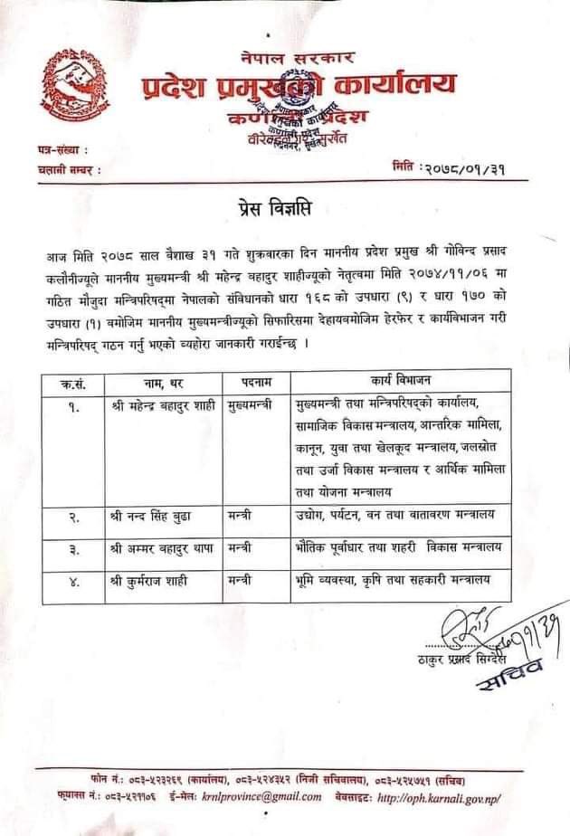जम्मा ४० सिट रहेको कर्णाली प्रदेशमा आठ वटा मन्त्री बनाइएको छ । संविधान अनुसार बढीमा २० प्रतिशत मन्त्री बनाउन पाउने प्रावधानमा टेक्दै मुख्यमन्त्री शाहीले बुधबार मन्त्रालय फुटाएर मन्त्री नियुक्त गरेका हुन ।