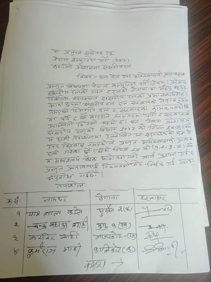 शाहीविरुद्ध नेकपा प्रदेशसभा संसदीय दलको विधान २०७५ को नियम २४ (१) बमोजिम अविश्वासको प्रस्ताव दर्ता गरिएको हो ।