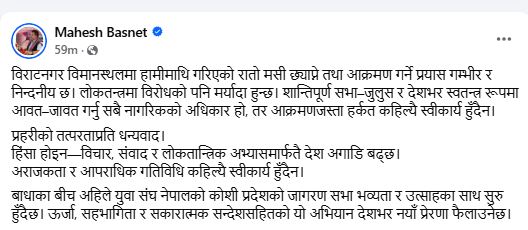 नेता बस्नेतले सामाजिक सञ्जालमा लेखेका छन्, ‘विराटनगर विमानस्थलमा हामीमाथि गरिएको रातो मसी छ्याप्ने तथा आक्रमण गर्ने प्रयास गम्भीर र निन्दनीय छ। लोकतन्त्रमा विरोधको पनि मर्यादा हुन्छ। शान्तिपूर्ण सभा–जुलुस र देशभर स्वतन्त्र रूपमा आवत–जावत गर्नु सबै नागरिकको अधिकार हो, तर आक्रमणजस्ता हर्कत कहिल्यै स्वीकार्य हुँदैन।’