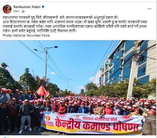 सामाजिक सञ्जालमा उनले लेखेकी छिन्, ‘महाभारतमा पाण्डवले युद्ध जिते, कौरवहरूले हारे, कारण– पाण्डवहरूको अभूतपूर्व एकता हो। आज विराटनगरमा क। महेश बस्नेतमाथि आक्रमण प्रयास भएछ। यो खबर सुनेर अत्यन्तै दुःख लाग्यो।’