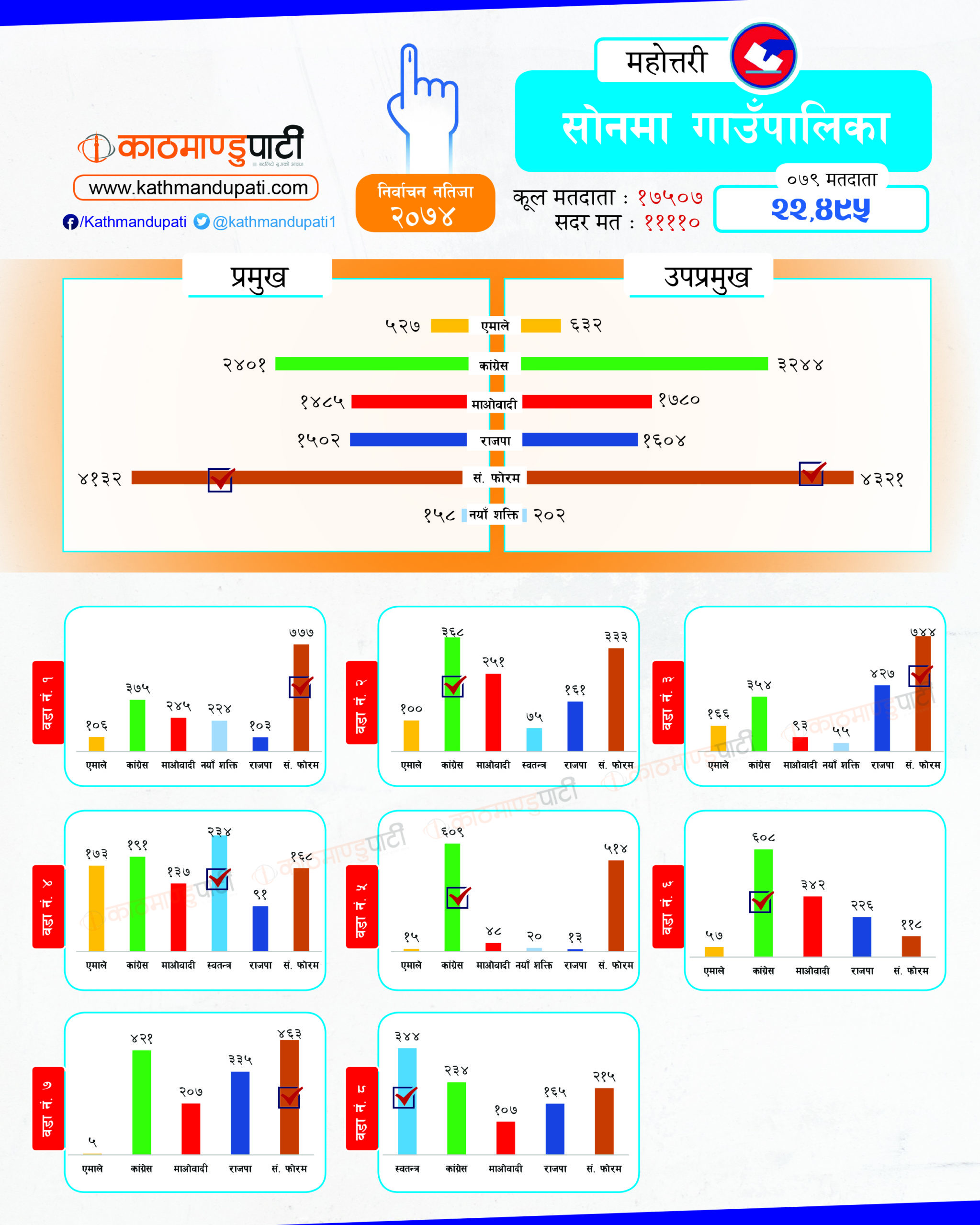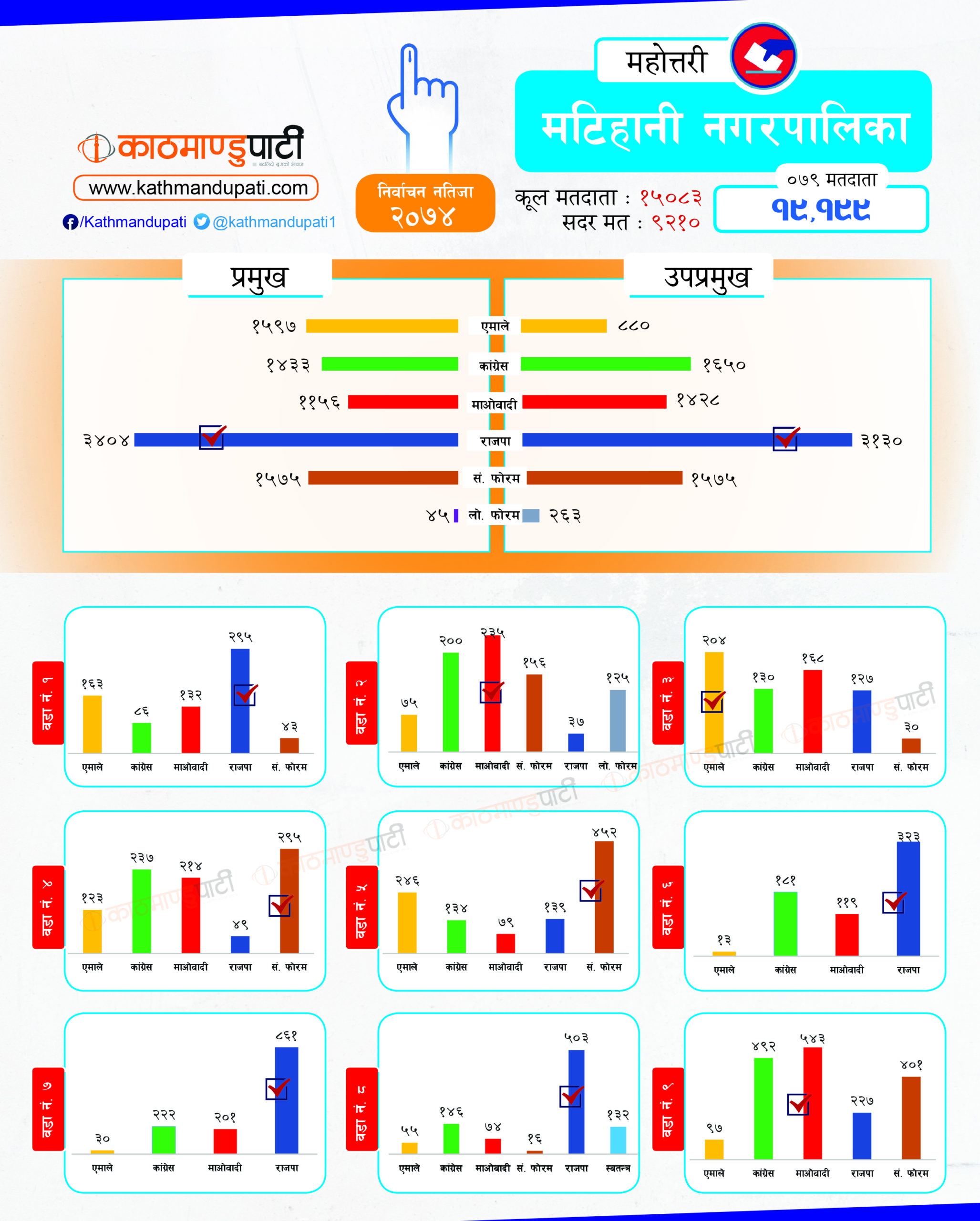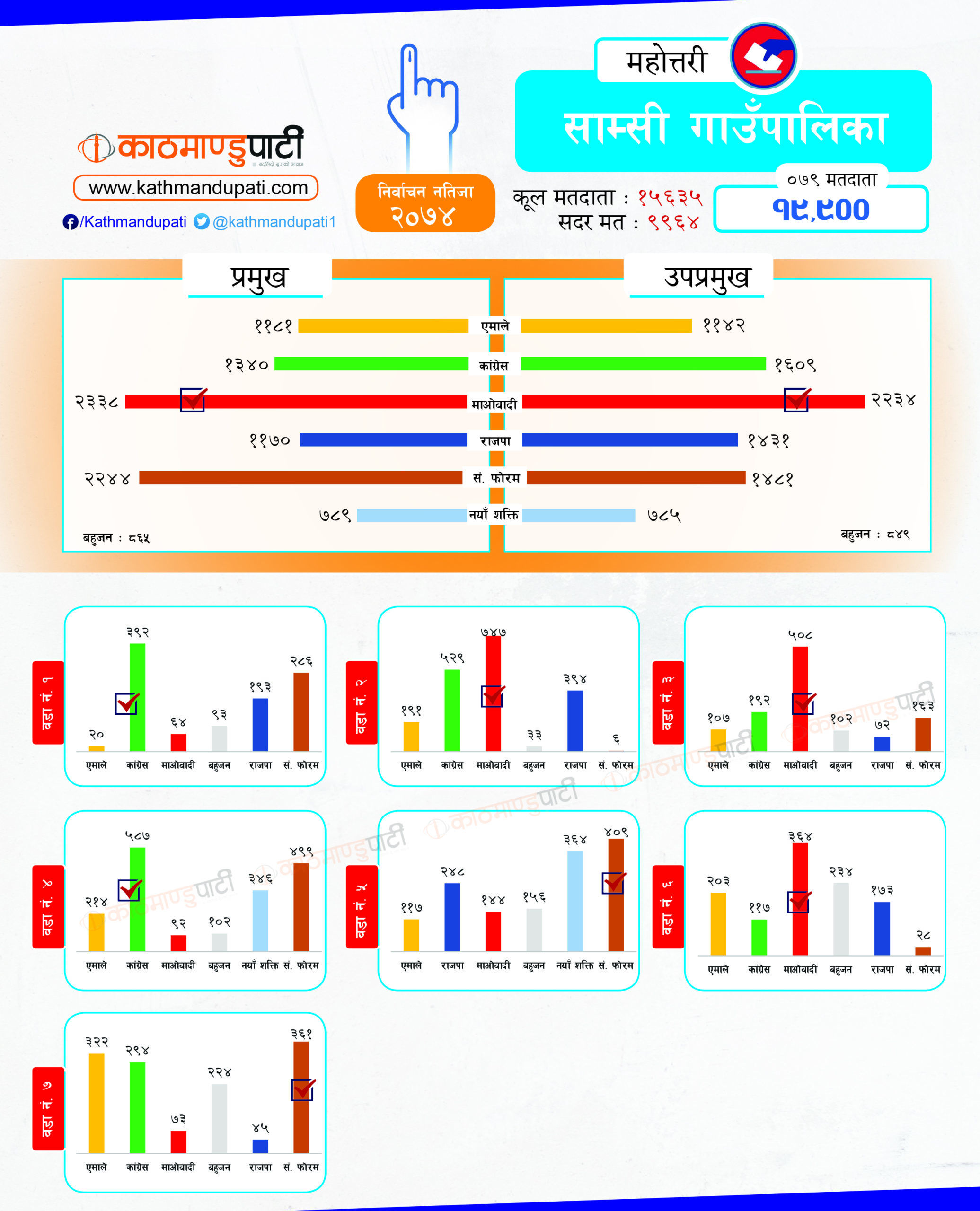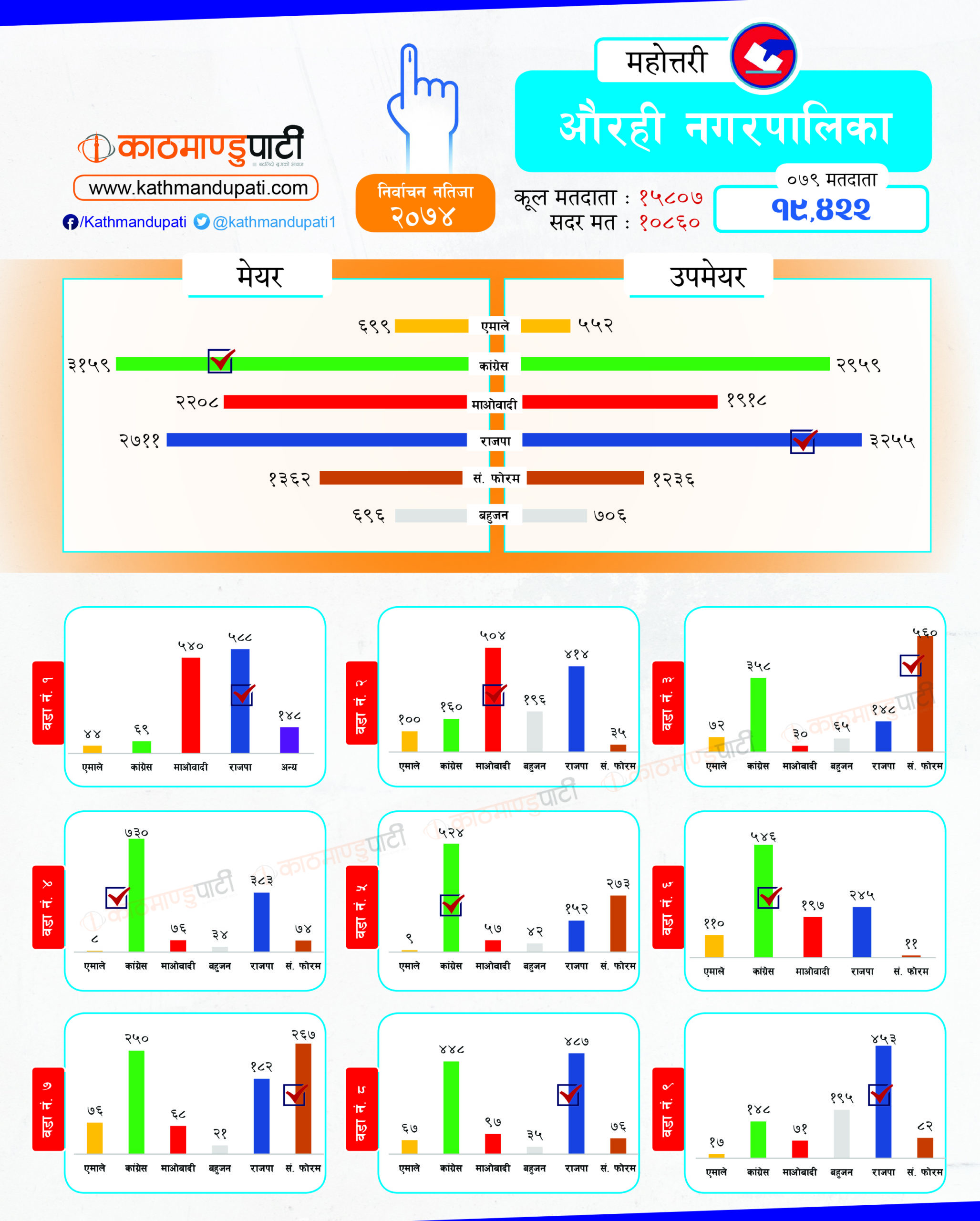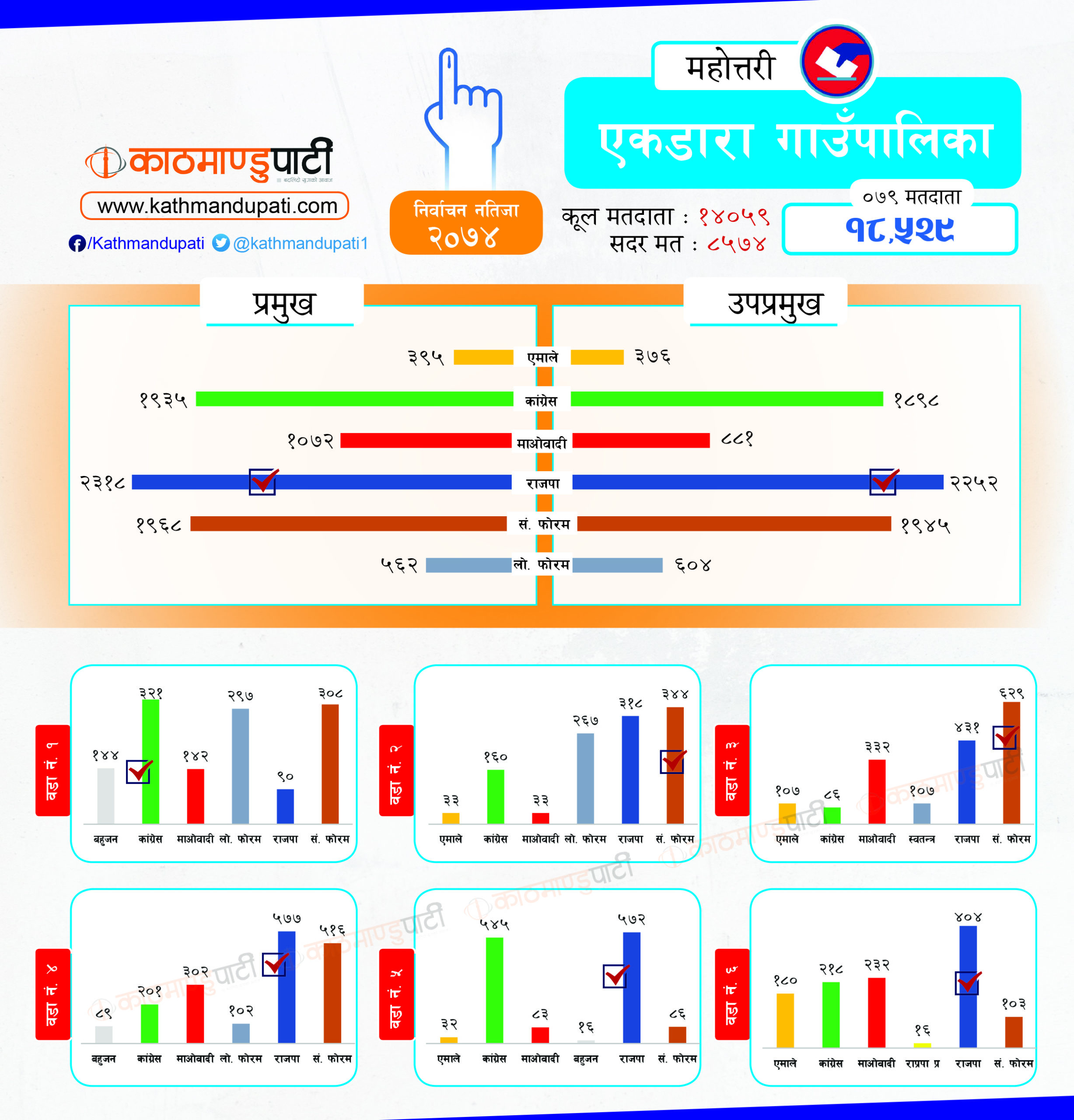कांग्रेसले लोहरपट्टी नगरपालिकामा मेयर–उपमेयर तथा बलवा र औरही नगरपालिकामा मेयर तथा संघीय समाजवादी फोरमले सोनमा गाउँपालिकाको अध्यक्ष–उपाध्यक्ष जितेको थियो । पहिले धेरै पालिका जितेको राजपा अहिले लोसपा भएको छ । तर, उसको अवस्था अहिले पहिलेको जस्तो छैन ।