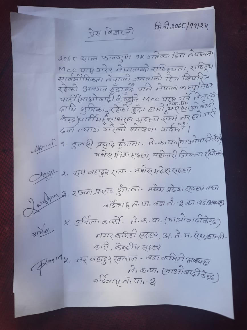 महोत्तरी – नेकपा माओवादी केन्द्र महोत्तरीका संयोजकसहित पाँच नेताले पार्टी त्यागको घोषणा गरेका छन ।