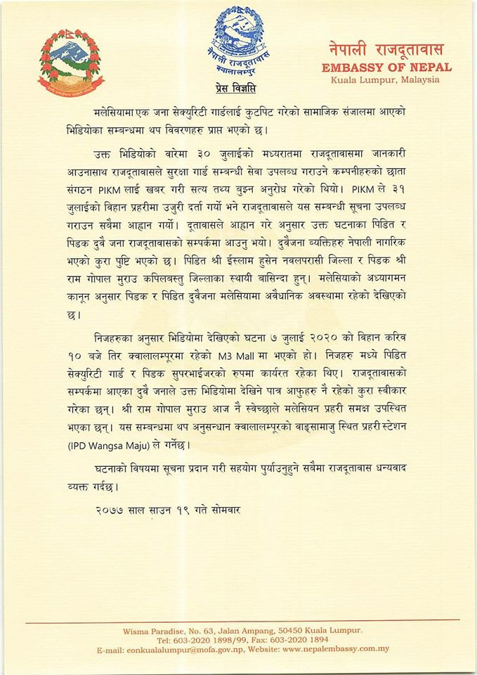 सोमबार विज्ञप्ति जारी गर्दै दूतावासले कुट्ने र कुटिने दुबै जना नेपाली नागरिक भएको जनाएको छ। उक्त घटना ७ जुलाईमा क्वालालम्पुरस्थित एमथ्री मलमा भएको हो। कुट्ने व्यक्ति सुपरभाइजरको रूपमा काम गर्ने कपिलवस्तुका रामगोपाल नुराउ हुन्। घटनाबारे थप अनुसन्धान र कारबाही मलेसियन प्रहरीले गर्ने दूतावासले जनाएको छ।