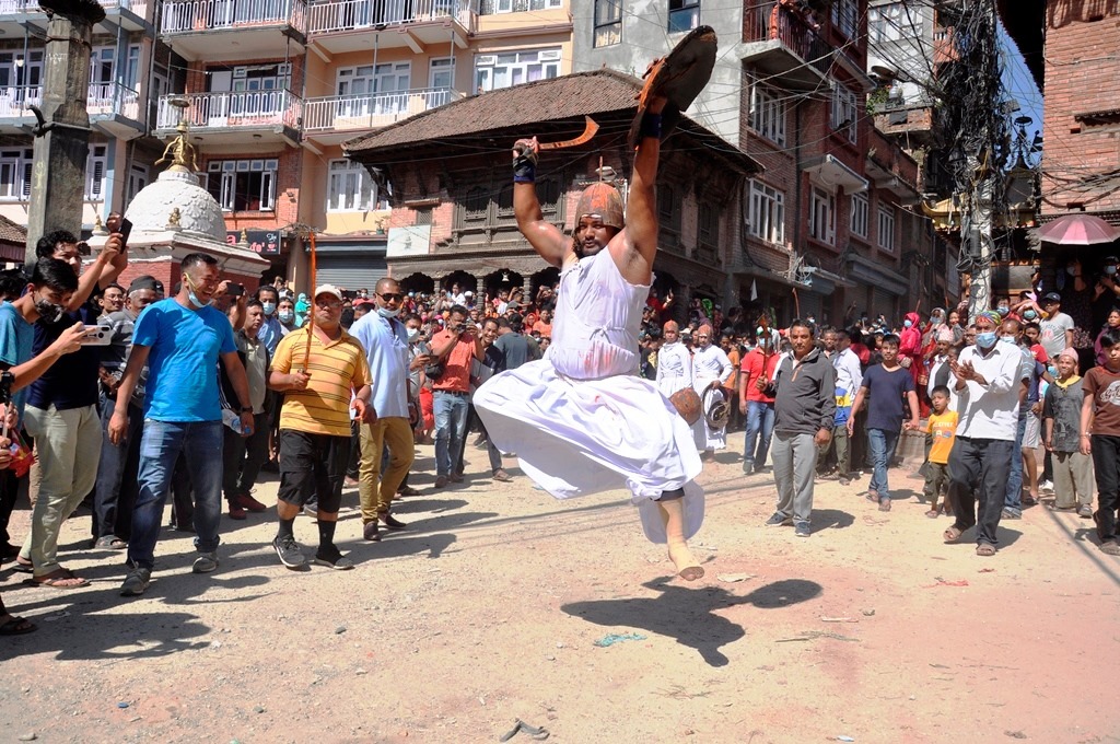 काठमाण्डु – बडादसैँको एघारौँ दिन पापाङ्कुशा एकादशीको अवसरमा बुधबार मध्यपुर थिमिमा मल्लकालीन युद्धको झल्को दिने गरी खाँ पिहाँवईगु (खाँ निस्कने) जात्रा सम्पन्न गरेको छ।