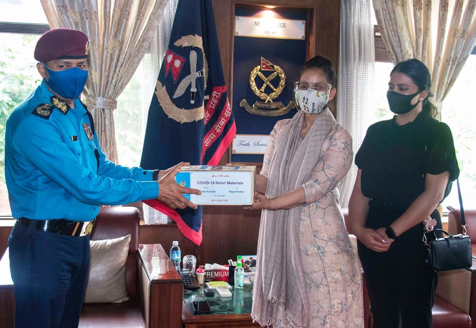 अभिनेत्री कोइरालाले प्रहरी प्रधान कार्यालयमा पुगेर प्रहरी महानिरीक्षक शैलेश थापा क्षेत्रीलाई स्वास्थ्य सामग्री सहयोग हस्तान्तरण गरेकी हुन् । उनले सामाजिक सञ्जालमार्फत प्रहरीलाई ४ हजार मास्क, २ हजार फेससिल्ड, १ हजार स्यानिटाइजर सहयोग गरेको जानकारी दिएकी छन् ।