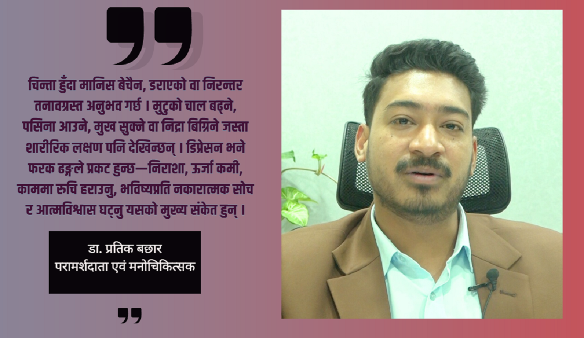 उनी भन्छन्, ‘चिन्ता हुँदा मानिस बेचैन, डराएको वा निरन्तर तनावग्रस्त अनुभव गर्छ । मुटुको चाल बढ्ने, पसिना आउने, मुख सुक्ने वा निद्रा बिग्रिने जस्ता शारीरिक लक्षण पनि देखिन्छन् । डिप्रेसन भने फरक ढङ्गले प्रकट हुन्छ—निराशा, ऊर्जा कमी, काममा रुचि हराउनु, भविष्यप्रति नकारात्मक सोच र आत्मविश्वास घट्नु यसको मुख्य संकेत हुन् ।’