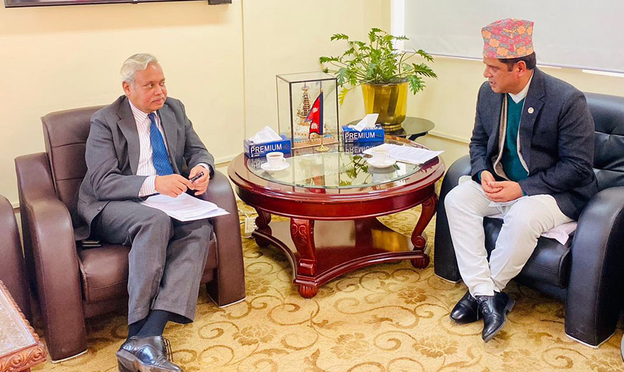 काठमाण्डु – उद्योग, वाणिज्य तथा आपूर्तिमन्त्री दामोदर भण्डारी र नेपालस्थित भारतीय राजदूत नवीन श्रीवास्तवबीच आज शिष्टाचार भेटवार्ता भएको छ ।