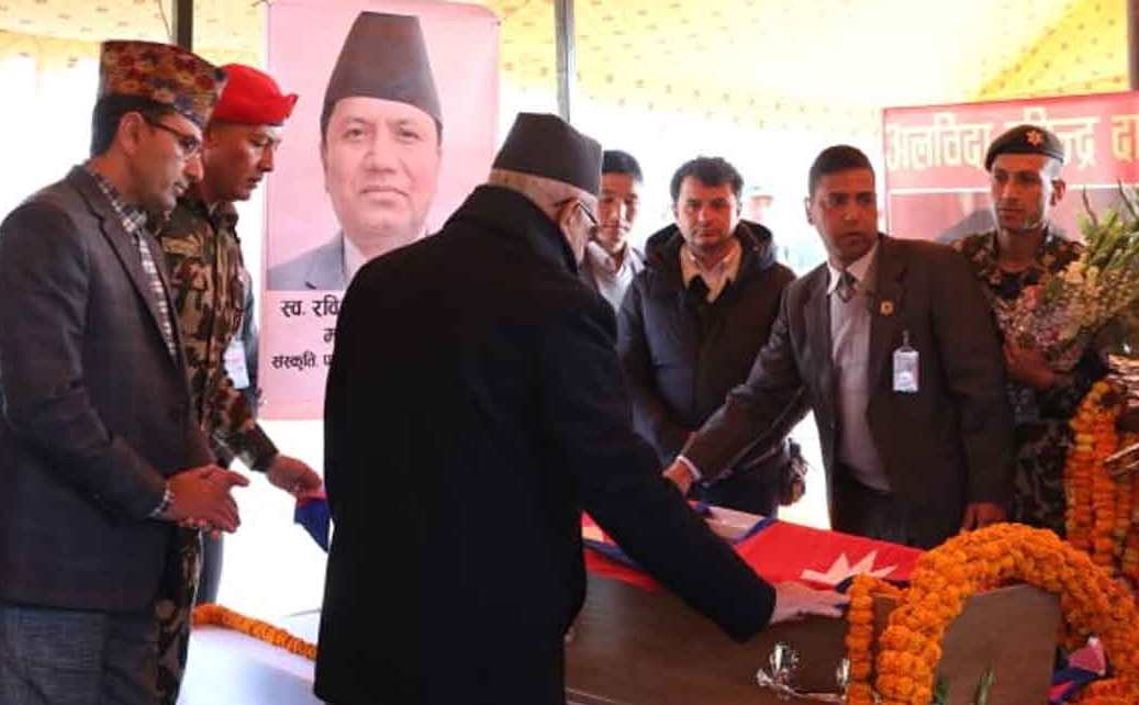 काठमाडौं – ताप्लेजुङमा हेलिकोप्टर दुर्घटनामा परी मृत्यु भएका पर्यटनमन्त्री रवीन्द्र अधिकारीसहित ७ जनालाई शुक्रबार टुँडिखेलमा राखेर श्रद्धाञ्जली दिने क्रम शुरु भएको छ । मन्त्री अधिकारीलगायत अन्य दिवंगतहरुलाई श्रद्धाञ्जली दिन बिहानैदेखि सर्वसाधारण टुँडिखेलमा भेला भएका छन् ।