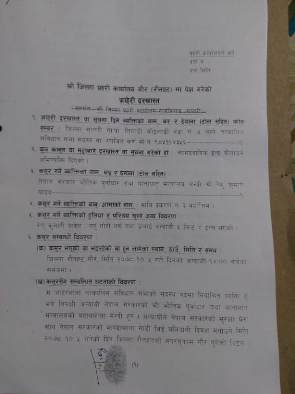 रौतहट – भौतिक पूर्वाधार तथा यातायातमन्त्री रेणुकुमारी यादवविरुद्ध जिल्ला प्रहरी कार्यालय रौतहटमा उजरी परेको छ । द्वन्द्व फैलाउने अभिव्यक्ति दिएको भन्दै नेपाली कांग्रेसका नेता रन्जित कर्णले मन्त्री यादवविरुद्ध हुलाकमार्फत उजुरी दिएका हुन् ।
