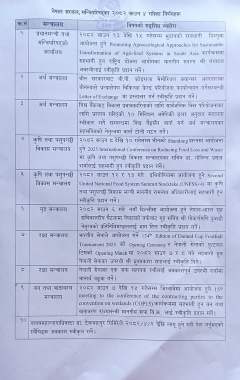 साउन ४ गते बसेको मन्त्रिपरिषद्का निर्णय सार्वजनिक