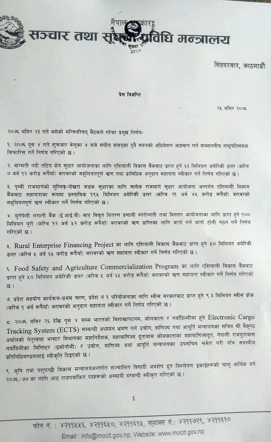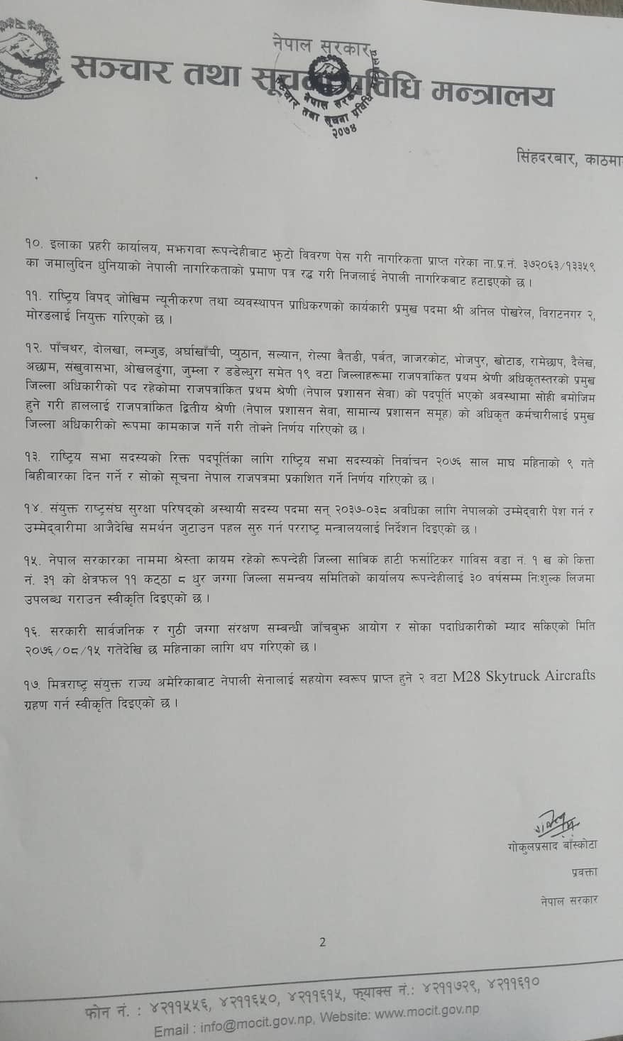 यसैगरी झूटो विवरण पेश गरेर नागरिकता प्राप्त गर्ने जमालुदिन धुनियाको नागरिकता रद्ध गर्ने, १९ जिल्लाहरुमा प्रशासन सेवा समूहका कर्मचारीलाई सीडीओ तोक्ने, राष्ट्रिय सभा सदस्यको निर्वाचन माघ ९ गते गर्नेलगायत निर्णय पनि सरकारले गरेको छ ।