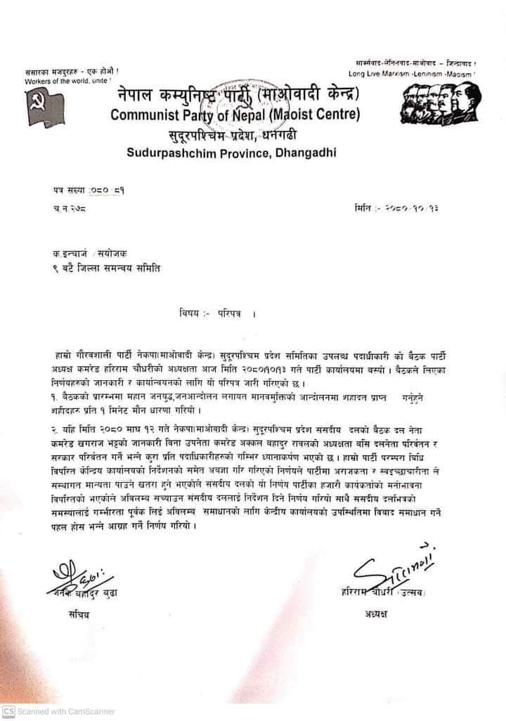 प्रदेश अध्यक्ष हरिराम चौधरीको अध्यक्षतामा बसेको माओवादी केन्द्र सुदूरपश्चिम प्रदेश कमिटी पदाधिकारी बैठकले दलको नेता परिवर्तन गर्ने निर्णय सच्याउन संसदीय दललाई निर्देशन दिएको हो ।