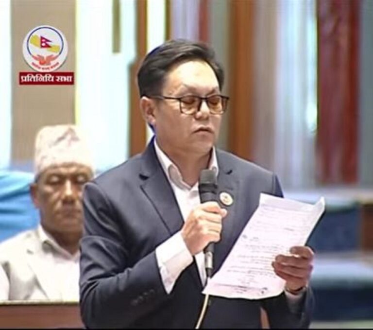 उनले भने, ‘सामान्य प्रशासन र भूमि सुधारमन्त्रीको बारेमा सर्वत्र मिडियामा आएको कुरा के हो ? मलाई राम्रो संग स्मरण छ यही उभिएर सम्माननीय प्रधानमन्त्रीज्यूले भन्नुभएको कुरा ‘म भ्रष्टाचार गर्दिन र गर्नपनि दिन्न । यो जुनीमा त के अर्को जुनीमा पनि चित्र गुप्ताको अगाडि उभिएर जवाफ दिन्छु । हामीलाई अर्को जुनी र चित्र गुप्ताको विश्वास छैन । त्यसैले सरकारको तर्फबाट यो सार्वभौमिक संसदलाई सत्यतथ्य जवाफ चाहियो ।’