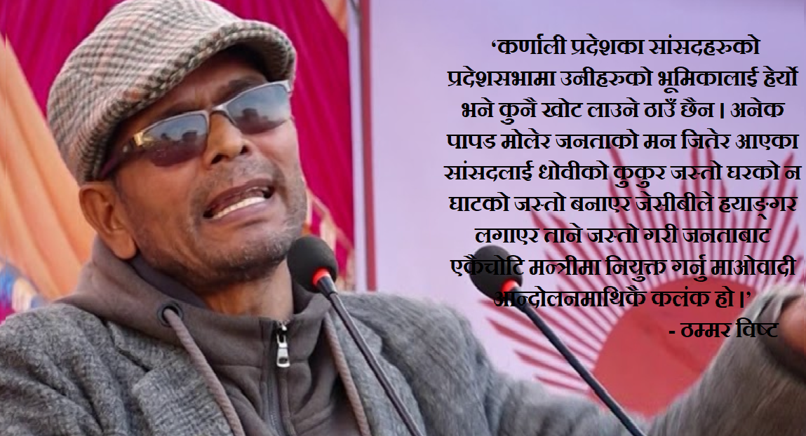 माओवादी कर्णालीका सचेतक ठम्बर विष्टले हुम्लाका गैरसांसद छिरिङ डम्डोल लामा (कार्चेन) लाई मन्त्री बनाउन सिफारिस गरेकोप्रति अपत्ति जनाउँदै पार्टीको उक्त निर्णय माओवादी आन्दोलनमाथिकै ‘कलंक’ भएको बताएका छन् ।
