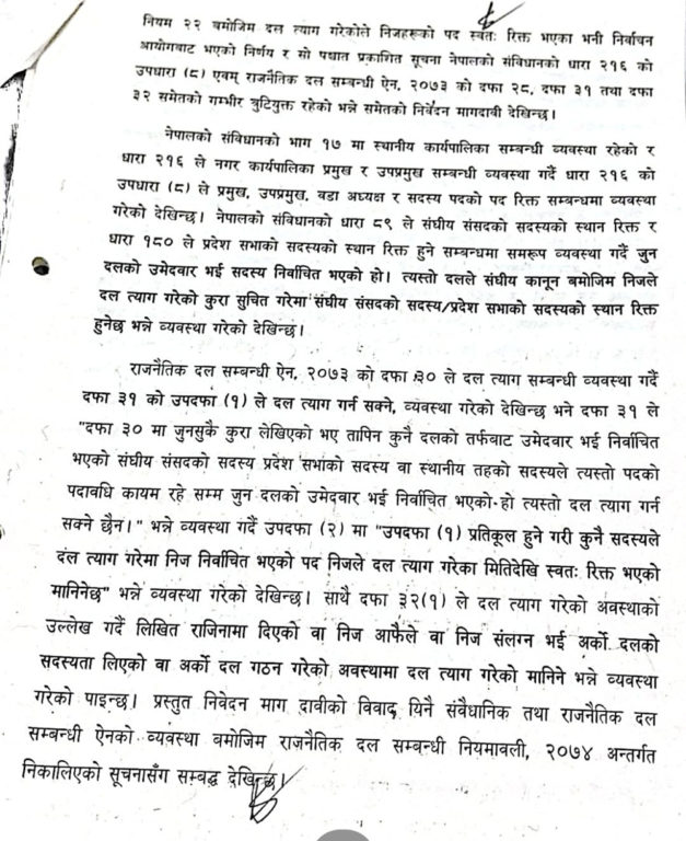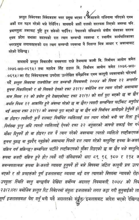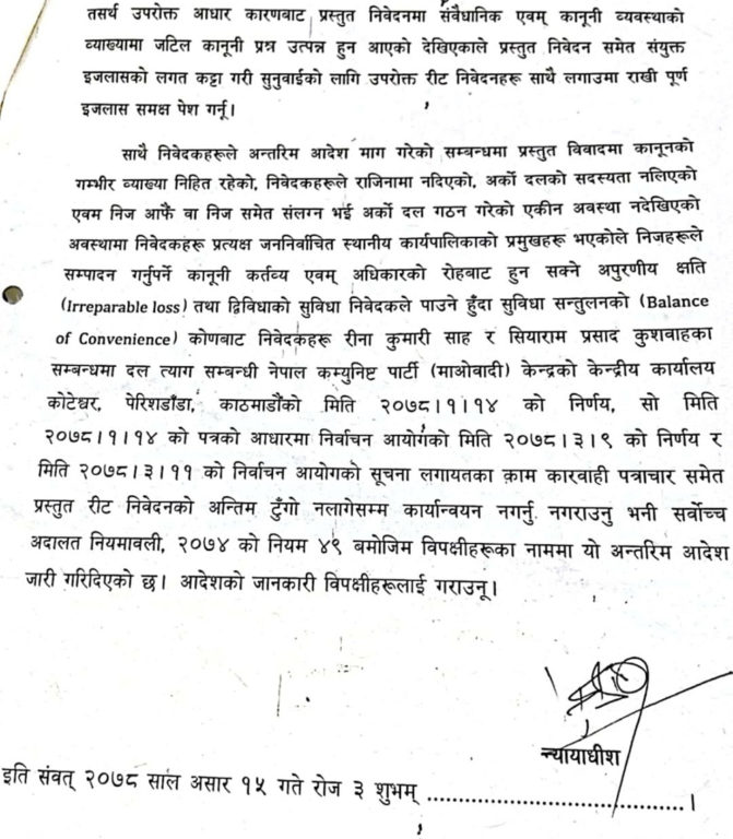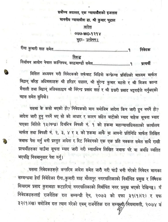न्यायाधीश कुमार चुडालको इजलासले माओवादी केन्द्र परित्याग गरेपछि कारबाहीमा परेका रौतहटको मौलापुर नगरपालिकाकी मेयर रीनाकुमारी साह र कटहरिया नगरपालिकाका मेयर सियाराम कुशवाहलाई कामकाज गर्न दिन अन्तरिम आदेश दिएको हो ।