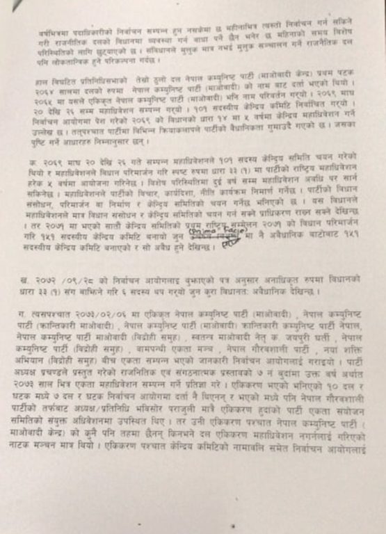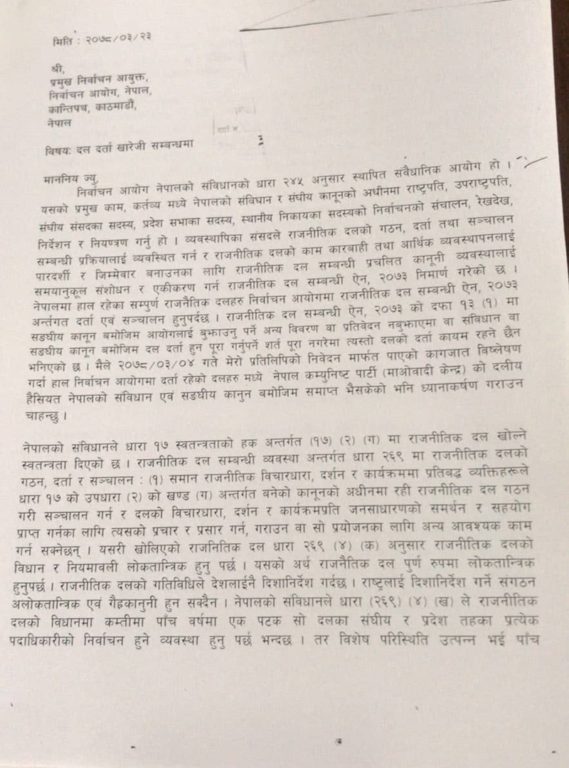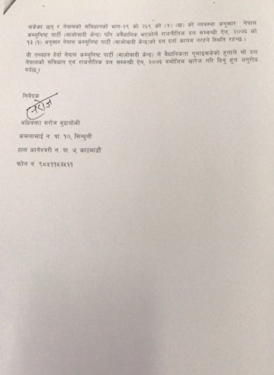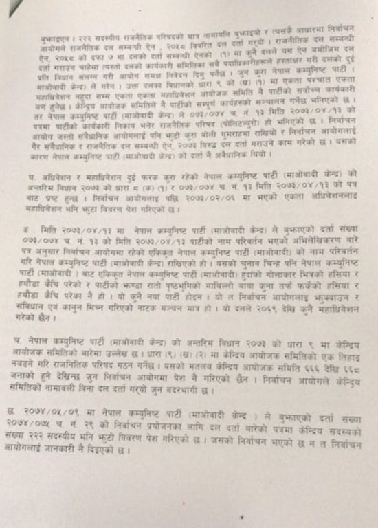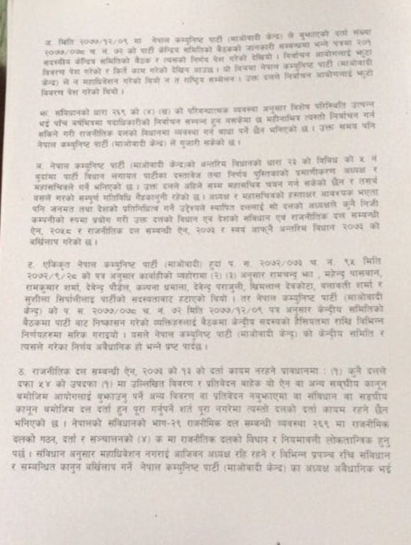 ‘संविधानअनुसार महाधिवेशन नगराई आजीवन अध्यक्ष रहिरहने र विभिन्न प्रपञ्च रची संविधान र सम्बन्धित कानुन बर्खिलाप गर्ने नेपाल कम्युनिस्ट पार्टी (माओवादी केन्द्र)का अध्यक्ष अवैधानिक भइसकेका छन् र नेपालको संविधानको भाग–२९ को २०६९ को (४) (ख)को व्यवस्थाअनुसार नेपाल कम्युनिस्ट पार्टी (माओवादी केन्द्र पनि अवैधानिक भएकोले राजनीतिक दलसम्बन्धी ऐन, २०७३ को १३ (१) अनुसार नेपाल कम्युनिस्ट पार्टी (माओवादी केन्द्र)को दल दर्ता कायम नरहने स्थिति रहन्छ । यी तथ्यहरु हेर्दा नेपाल कम्युनिस्ट पार्टी (माओवादी केन्द्रले वैधानिकता गुमाइसकेको हुनाले सो दल नेपालको संविधान एवं राजनीतिक दलसम्बन्धी ऐन, २०७३ बमोजिम खारेज गरिदिनुहुन अनुरोध गर्दछु,’ आयोगमा बुझाइएको निवेदनमा भनिएको छ ।