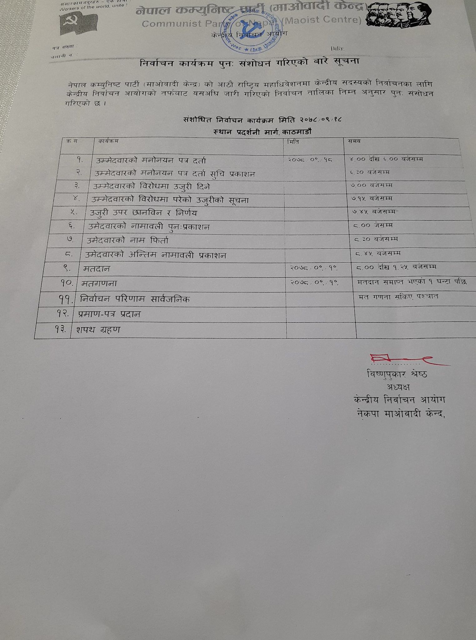 काठमाण्डु – नेकपा माओवादी केन्द्रको निर्वाचन तालिका फेरी संशोधन भएको छ । नयाँ केन्द्रीय समिति र १५ सदस्यीय पदाधिकारी टीम सर्वसम्मत बनाउने प्रयासस्वरुप छलफल जारी रहेकाले निर्वाचन कार्यतालिका संशोधन गरिएको हो ।