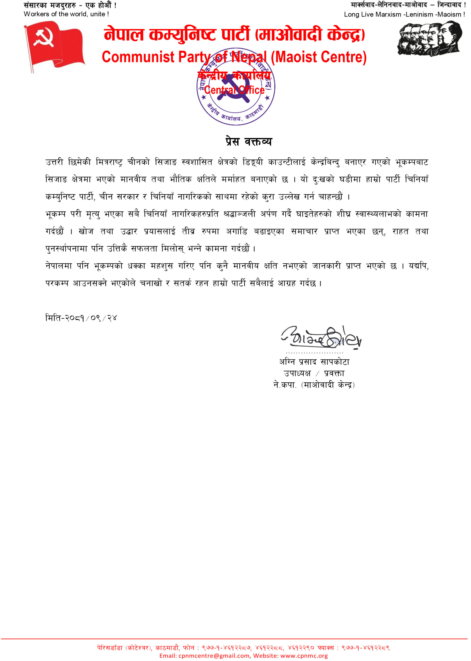 पार्टी उपाध्यक्ष तथा प्रवक्ता अग्नि प्रसाद सापकोटाले बुधबार प्रेस वक्तव्य जारी गर्दै चीनको सिजाङ क्षेत्रमा भूकम्पले भएको मानवीय र भौतिक क्षतिले मर्माहत बनाएको जनाएको छ ।
