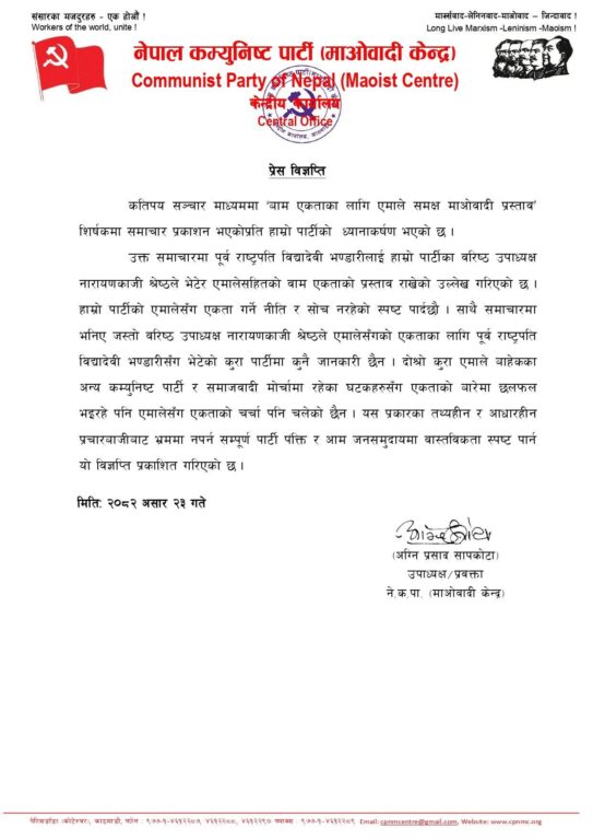 ‘कतिपय सञ्चारमाध्यममा ‘बाम एकताका लागि एमालेसमक्ष माओवादीको प्रस्ताव’ शीर्षकमा समाचार प्रकाशन भएकोप्रति हाम्रो पार्टीको ध्यानाकर्षण भएको छ । उक्त समाचारमा पूर्वराष्ट्रपति विद्यादेवी भण्डारीलाई हाम्रो पार्टीका वरिष्ठ उपाध्यक्ष नारायणकाजी श्रेष्ठले भेटेर एमालेसहितको वाम एकताको प्रस्ताव राखेको उल्लेख गरिएको छ,’ विज्ञप्तिमा उल्लेख छ, ‘हाम्रो पार्टीको एमालेसँग एकता गर्ने नीति र सोच नरहेको स्पष्ट पार्दछौं । साथै समाचारमा भनिए जस्तो वरिष्ठ उपाध्यक्ष नारायणकाजी श्रेष्ठले एमालेसँगको एकताका लागि पूर्वराष्ट्रपति विद्यादेवी भण्डारीसँग भेटेको कुरा पार्टीमा कुनै जानकारी छैन ।’