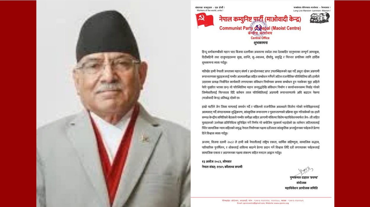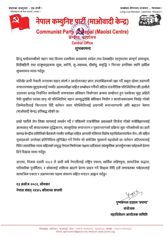 काठमाण्डु – नेकपा माओवादी केन्द्रका अध्यक्ष पुष्पकमल दाहाल ‘प्रचण्ड’ले विजयादशमीका अवसरमा स्वदेश तथा देशबाहिर रहेका सम्पूर्णमा शुभकामना व्यक्त गरेका छन् ।