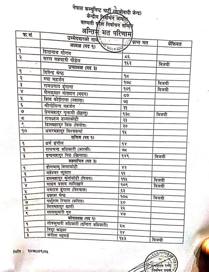 निर्वाचन समितिका अनुसार उपाध्यक्षमा रूपा मर्हजन, रामप्रसाद ढुंगाना र प्रेम बहादुर पुलामी चयन भएका छन्। सचिवमा इन्द्रबहादुर थिङ तथासहसचिवमा दलबहादुर बुर्लाकोटी, माधवप्रसाद लामिछाने र प्रकाश श्रेष्ठ निर्वाचित भएका छन् । कोषाध्यक्षमा संगिता भट्टराई निर्वाचित भएकी छिन्।
