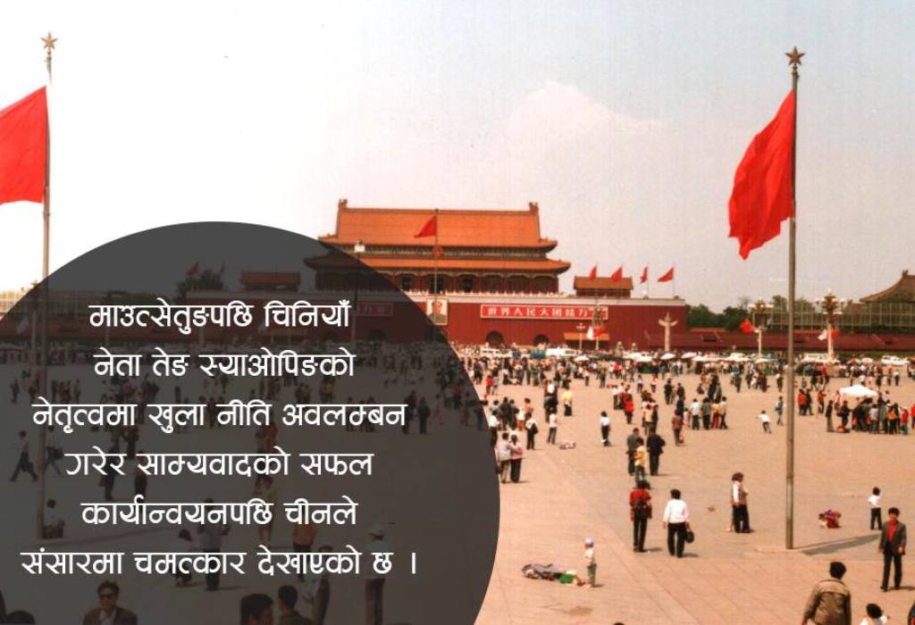 चीनको नेतृत्व तहमा रहेका देशभक्त र राष्ट्र निर्माणमा सधैँ सरिक छन् । चीन अहिले भौगोलिक रुपमा मात्र होइन, भौतिक उन्नतिका हिसाबले संसारकै उच्चकोटीको समृद्ध राष्ट्रका रुपमा देखा परेको छ । माओले करिब तीन दशक शासन गरे । माओत्सेतुङको शव बडो सम्मानका साथ तेनमेन स्क्वाएर छेउको ऐतिहासिक घरमा राखिएको छ । माओपछि तेङ सियाओ पिङ सत्तामा आएपछि उनले समाजवादी अवधारणाबाट खुला अर्थतन्त्र निजीकरण गराएर चीनको विकासमा ठूलो परिवर्तन ल्याउने काम गरे ।