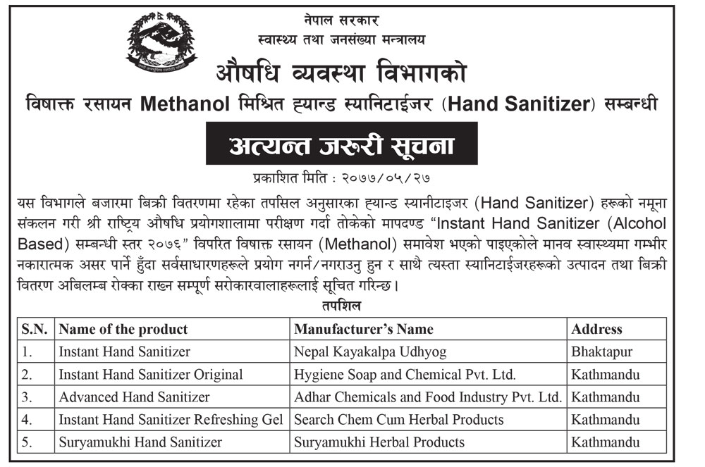 ती स्यानिटाइजरहरु प्रयोग नगर्न विभागले सर्वसधारणलाई सूचनामार्फत आग्रह समेत गरेको छ । क्षणिक नाफाका लागि उद्योगहरुले मिथानोल प्रयोग गरेको स्यानिटाइजर प्रयोग गर्दा स्वास्थ्यमा यसको प्रतिकूल असर पर्ने विभागले जनाएको छ ।