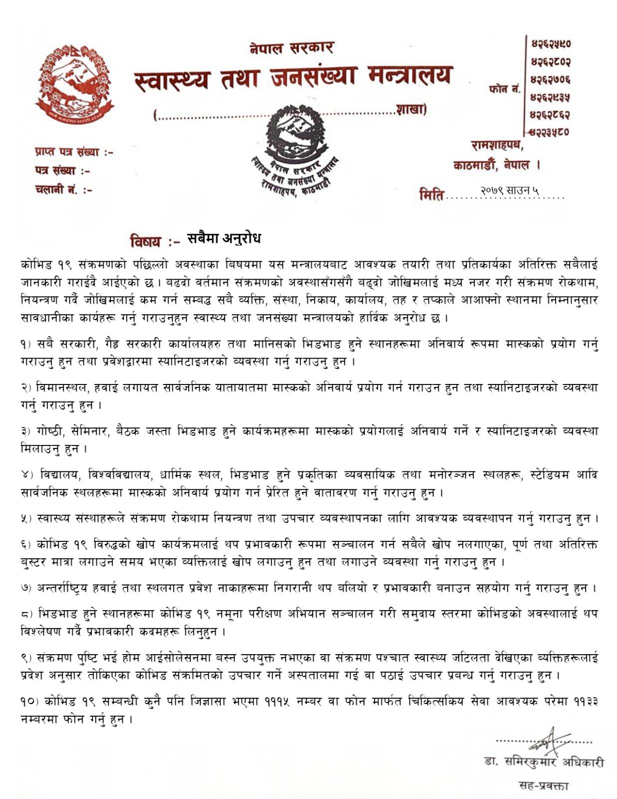 मन्त्रालयले बिहीबार सूचना जारी गर्दै कोरोना भाइरसको संक्रमण जोखिम कम गर्न विमानस्थल, हवाई लगायत सार्वजनिक यातायातमा मास्कको अनिवार्य प्रयोग र स्यानिटाइजरको व्यवस्था गर्न निर्देशन दिएको हो ।