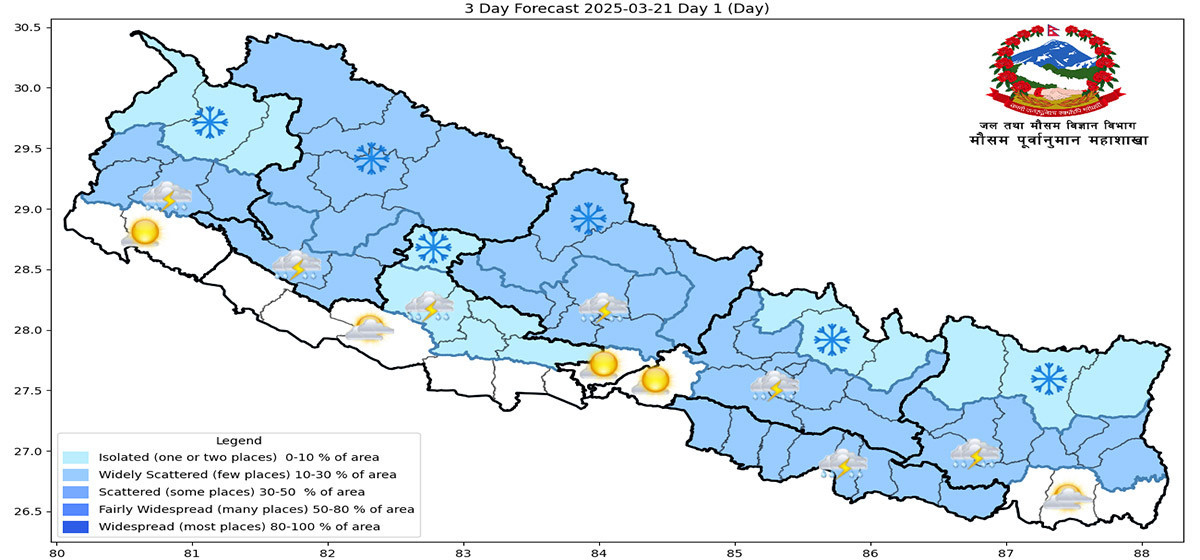 कोशी, मधेश, गण्डकी र कर्णाली प्रदेशका केही स्थान तथा बाँकी प्रदेशका पहाडी भागका एक दुई स्थानमा मेघगर्जन र चट्याङसहित हल्का वर्षा हुने सम्भावना छ। देशका उच्च पहाडी तथा हिमाली भागका एक–दुई स्थानमा हल्का हिमपातको सम्भावना पनि छ।