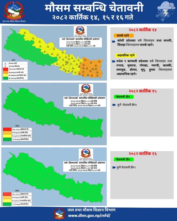 शनिबार राति कोशी, बागमती र गण्डकीका पहाडी तथा हिमाली भू–भागमा छिटपुट वर्षा र हल्का हिमपात हुन सक्ने महाशाखाले जनाएको छ ।