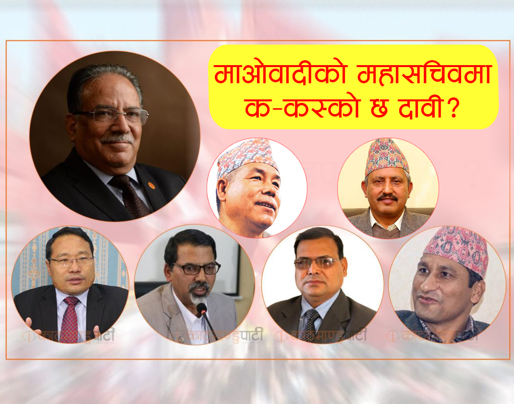 माओवादीमा मुख्यगरी तीन नेताहरुबीच महासचिवमा प्रतिस्पर्धा हुने सम्भावना छ । माओवादीको स्थायी समितिका सदस्यहरु वर्षमान पुन, शक्ति वस्नेत र जनार्दन शर्माबीच महासचिवको लागी प्रतिस्पर्धा हुनेछ । तर, तिनै नेताहरुबीच सहमति नभएको अवस्थामा महासचिवा नेता कृष्णबहादुर महरा र पम्फा भुषालमध्ये एक जना बन्ने सम्भावना पनि उत्तिकै छ । यद्यपी महराले अहिलेसम्म औपचारिक रुपमा अध्यक्ष प्रचण्डसंग आफ्नो इच्छा भने राखिनसकेको स्रोतको दावी छ ।