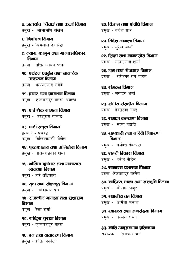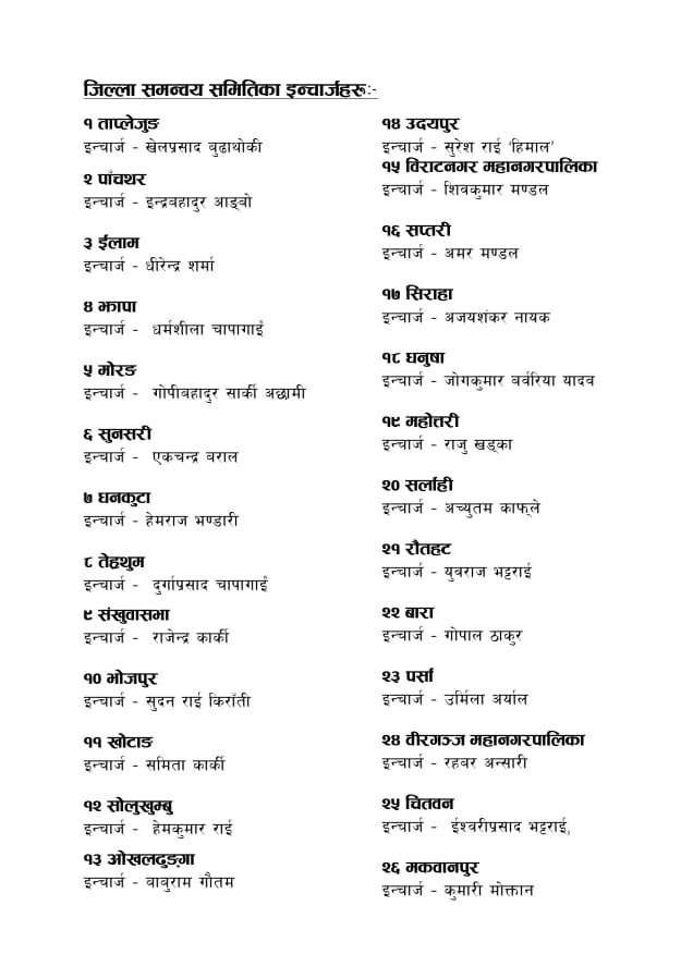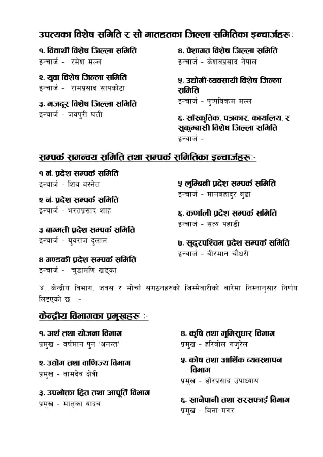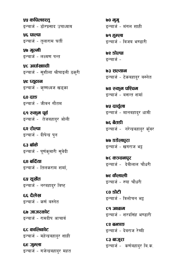 कर्णालीमा शक्ति बस्नेत इन्चार्ज तोकिएका छन् । सह–इन्चार्जमा कालीबहादुर मल्ल, टेकबहादुर बस्नेत र महेन्द्रबहादुर शाहीलाई तोकिएको छ। यहांको अध्यक्षमा राजकुमार शर्मा र सचिवमा रामदीप आचार्यले जिम्मेवारी पाएका छन्।