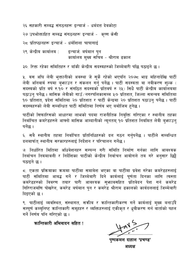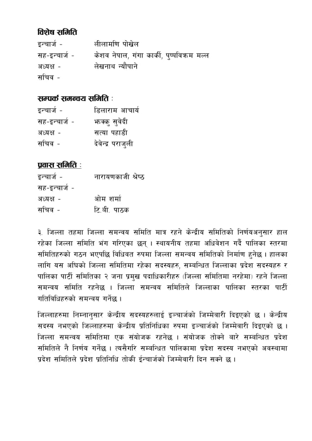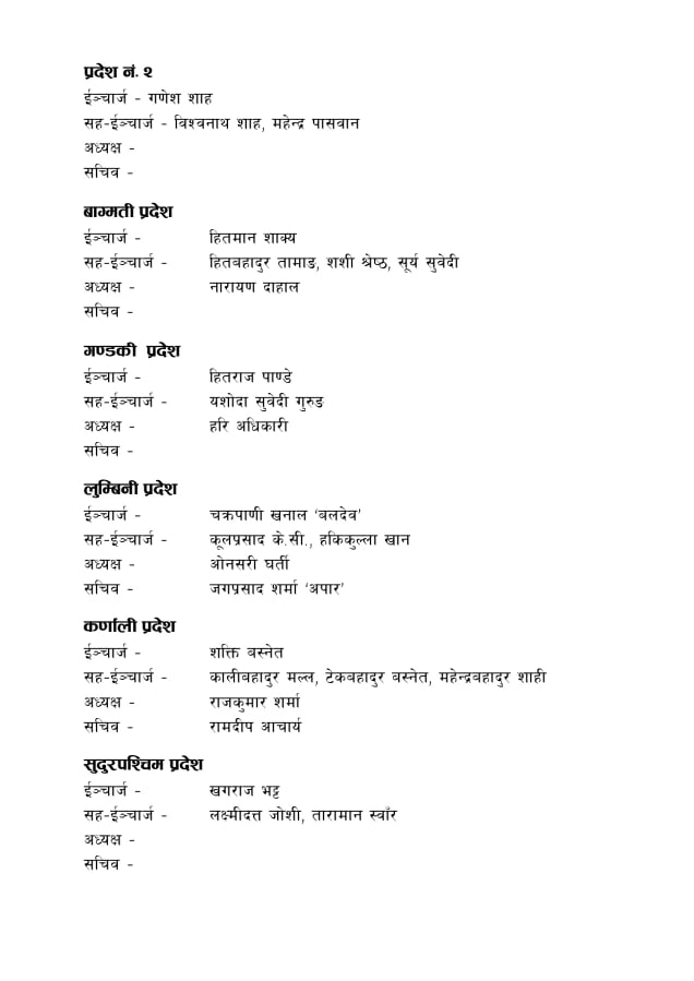 लुम्बिनी प्रदेश इन्चार्जमा चक्रपाणि खनाल चयन भएका छन् । सहइन्चार्जमा कुलप्रसाद केसी र हरिकुल्ला खानलाई जिम्मेवारी दिइएको छ । यो प्रदेशको अध्यक्षमा ओनसरी घर्ती चयन हुंदा सचिवमा जगतप्रसाद शर्माले जिम्मेवारी पाएका छन् ।