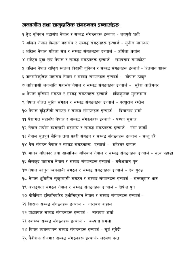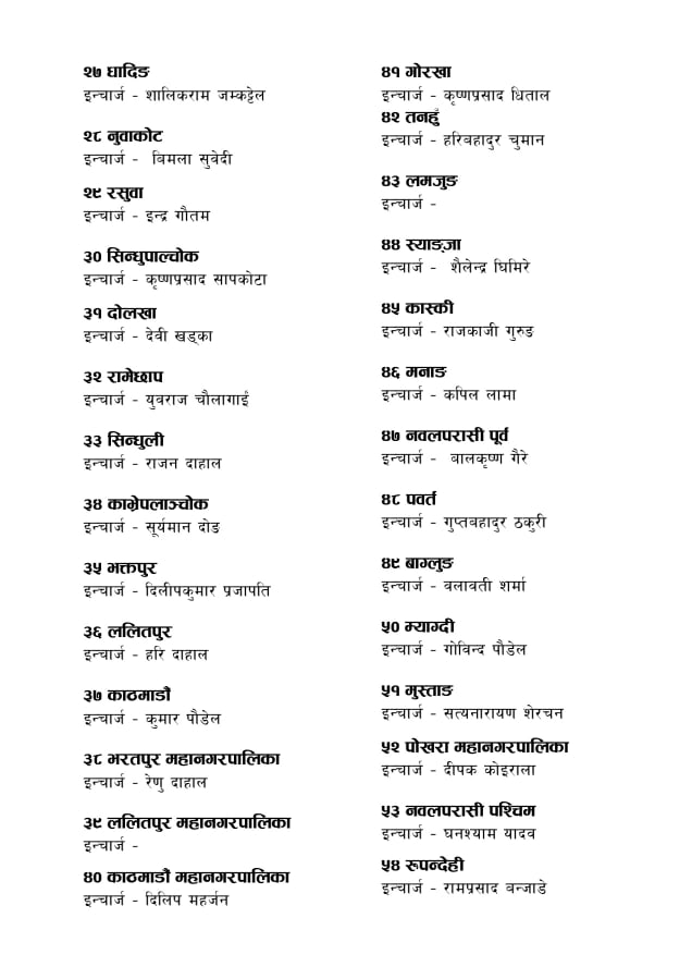 बागमती प्रदेश इन्चार्जमा हितमान तामाङ चयन भएका छन् । सह–इन्चार्जमा हितबहादुर तामाङ शशी श्रेष्ठ र सूर्य सुवेदी तोकिएका छन्। यो प्रदेशको अध्यक्षमा नारायण दाहाल तोकिंदा सचिव पद खाली राखिएको छ।