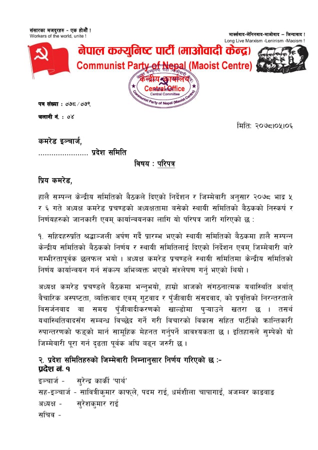 काठमाण्डु- माओवादी केन्द्रले सांगठनिक जिम्मेवारी टुंगो लगाएको छ । माओवादी केन्द्रको स्थायी समिति बैठकले पार्टीको प्रदेश,जिल्ला र विभागहरुको नेतृत्व टुंगो लगाएको हो । माओवादीले सातै प्रदेशका प्रमुखहरुको जिम्मेवारी टुंगो लगाएपनि केही प्रदेशका सहइन्चार्ज र सचिवहरुको भने टुंगो लगाउन भने असफल भएको हो ।