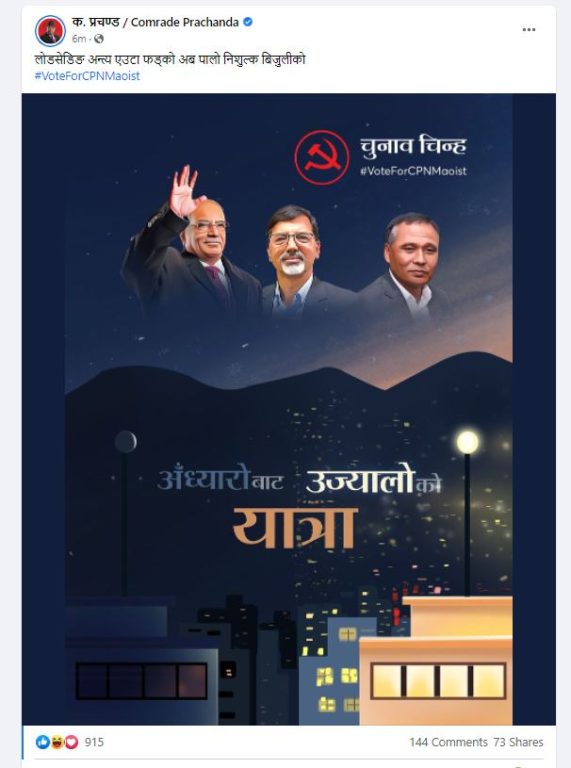 काठमाण्डु – विद्युत् प्राधिकरण कार्यकारी निर्देशक कुलमान घिसिङको फोटो माओवादी केन्द्रले चुनाव प्रचारमा प्रयोग गरेको छ । माओवादी केन्द्रका अध्यक्ष पुष्पकमल दाहालले ‘लोडसेडिङ अन्त्य एउटा फड्को, अब पालो निःशुल्क बिजुलीको’ शीर्षकमा उनको फोटो राख्दै फेसबुकमा पोस्टर सेयर गरेका छन् ।
