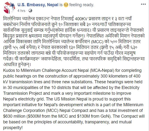 दूतावासले फेसबुकमा एमसीसीमार्फत ५०० मिलियन डलर, झन्डै ५५ अर्ब रुपैयाँ र नेपाल सरकारको १३० मिलियन डलर अर्थात झन्डै १५ अर्ब गरी ६३० मिलियन डलरको लागतमा बन्ने परियोजनाहरूमा सहयोग गर्न पाउँदा गौरव महशुस भएको जनाएको छ । दूतावासले ती कार्यक्रमहरू जवाफदेहिता,पारदर्शिता, तथा पारस्परिक समृद्दिको सिद्दान्तहरूमा आधारित हुने पनि बताएको छ ।