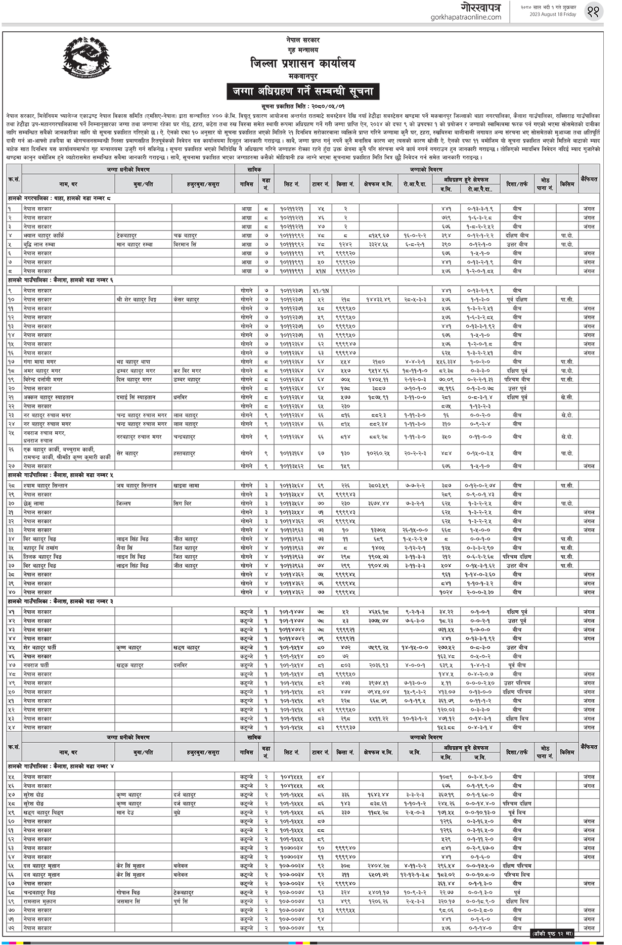 जिल्ला प्रशासन कार्यालय मकवानपुरले आज सूचना जारी गर्दै रातमाटे सबस्टेसनदेखि नयाँ हेटौँडा सबस्टेसन खण्डमा पर्ने थाहा नगरपालिका, कैलाश गाउँपालिका, राक्सिराङ गाउँपालिका तथा हेटौँडा उपमहानगरपालिकामा पर्ने जग्गा,जग्गामा रहेका घर गोठ,टहरा, कटेरा तथा रुख विरुवा समेत स्थायी रूपमा अधिग्रहण गरिने जनाएको छ ।