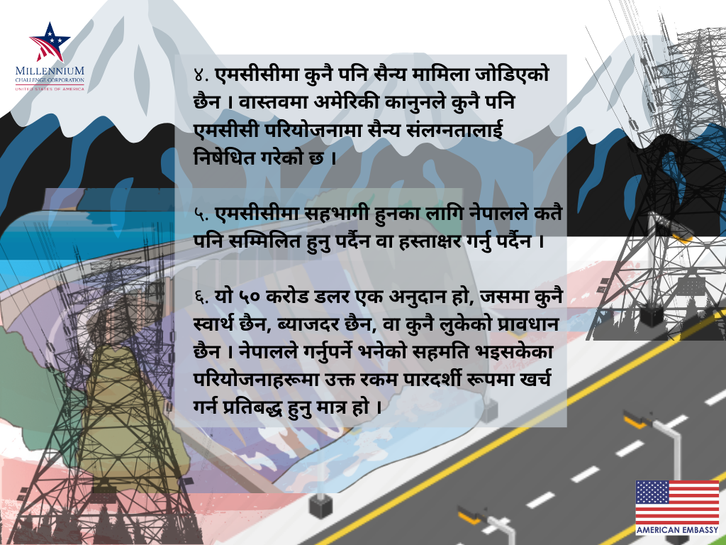 शुक्रबार दूतावासले एमसिसीका १० महत्वपूर्ण बुँदा सार्वजनिक गर्दै भनेको छ, ‘एमसिसीमा कुनै पनि सैन्य मामिला जोडिएको छैन। वास्तवमा अमेरिकी कानूनले कुनै पनि एमसीसी परियोजनामा सैन्य संलग्नतालाई निषेधित गरेको छ।’ एमसीसीमा सहभागी हुनका लागि नेपालले कतै पनि सम्मिलित हुनुपर्दैन वा हस्ताक्षर गर्नुपर्दैन,’ दूतावासद्वारा शुक्रबार जारी विज्ञप्तिमा भनिएको छ।