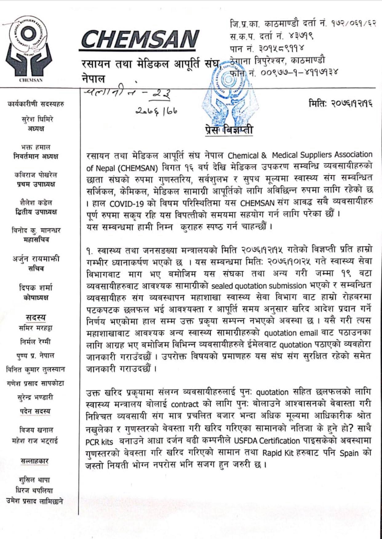 स्वास्थ्य सेवा विभागले संघका पदाधिकारी र व्यवसायीलाई बोलाएर कोटेशन मागेको थियो । तर खरिद गर्दा केही निश्चित व्यापारीसंग अत्यधिक मुल्यमा सामान खरिद गरिएको उनिहरुको आरोप छ ।