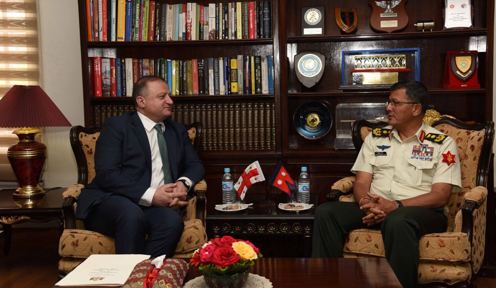 काठमाडौं – प्रधानसेनापति पूर्णचन्द्र थापा र जर्जियाका गैर आवसीय राजदूत Archil Dzuliashivili बीच सोमबार जङ्गी अड्डामा शिष्टाचार भेटवार्ता भएको छ ।