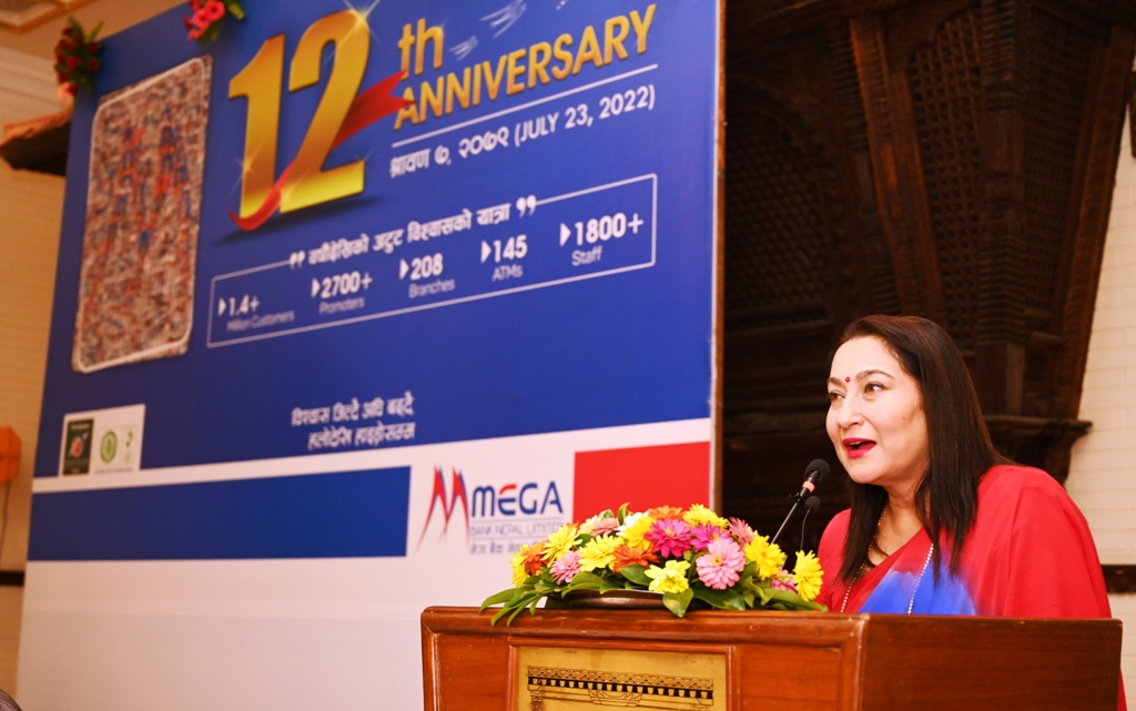 ‘संस्थापकहरुको सोच र भिजनका कारण मेगा बैंक आज देशकै विश्वाशिलो र अग्रणी बैंकको रुपमा स्थापित भएको छ । बैंकको संचालन सुव्यवस्थित किसिमले परिलक्षित बाटोमा आधार शिविरहरु खडा गर्दै गन्तव्यको उचाई तर्फ अग्रसर भएको छ । स्थापनाको १२ बर्ष पूरा गरी १३ बर्ष प्रवेश गरिरहँदा संस्थापकज्यूहरु सँगसँगै यस बैंकका लागि कर्मचारीवर्ग, ग्राहकवर्ग र सरोकारवाला सम्बद्ध सबैको निकै ठूलो योगदान रहेको छ । हलोदेखि हाइड्रोसम्म भन्ने नाराका साथ यो बैंकको यात्रा अगाडि बढेको थियो । आजसम्म आइपुग्दा थुप्रै वित्तीय सूचकहरुमा यो बैंकको अवस्था उत्साहमुलक देखिएको छ ।’ उनले भनिन् ।