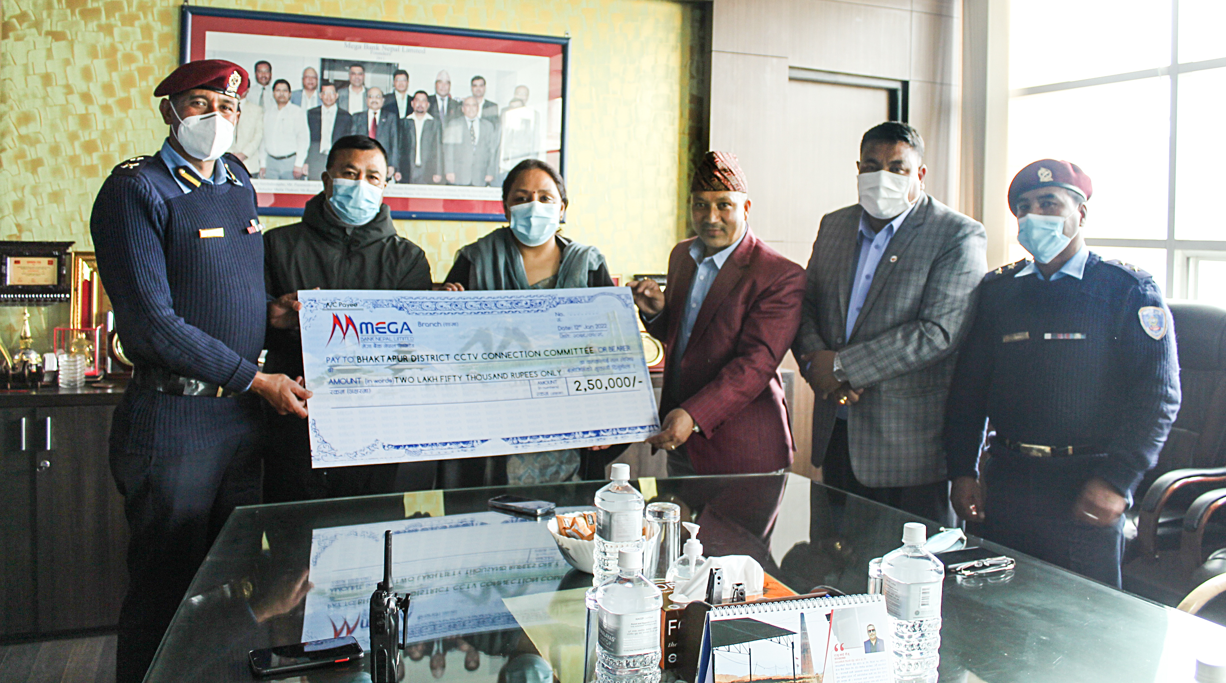 मेगा बैंक नेपाल लिमिटेडकी सिइओ अनुपमा खुञ्जेलीले बैंकको केन्द्रीय कार्यालय राइजिङ मलमा एक समारोहबीच भक्तपुर जिल्ला सिसिटिभी जडान समितिका पदाधिकारीलाई सिसिटिभी खरिदका लागि दुई लाख पचास हजार रुपैंयाको चेक हस्तान्तरण गरेकी हुन् । सो अवसरमा उक्त समितिका संयोजक प्रदिप कुमार श्रेष्ठ, कोषाध्यक्ष नविन प्रजापति, सचिव पदमलाल शिलाकार र सदस्य सचिव प्र.ना.उ. राजु पाण्डेको सहभागिता रहेको थियो ।
